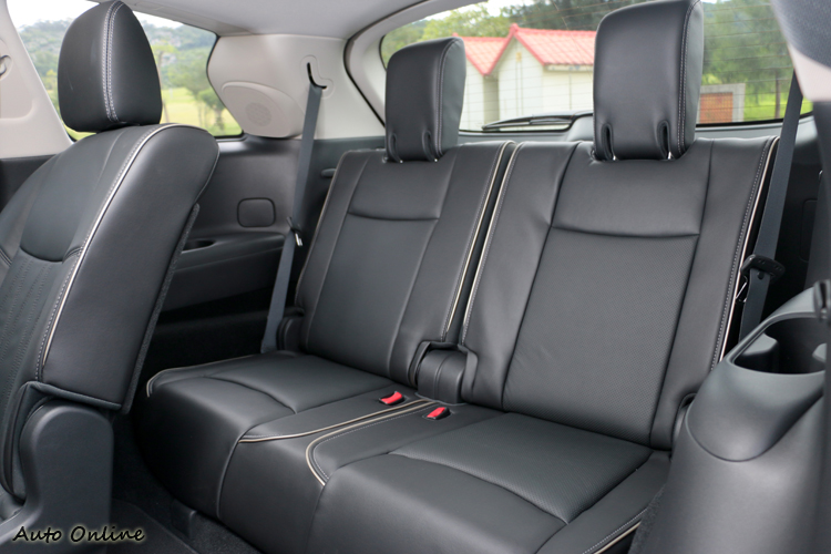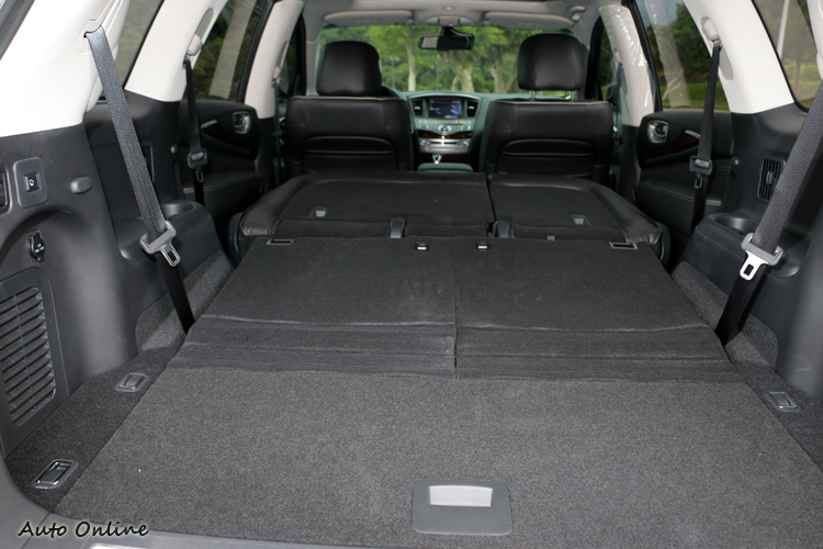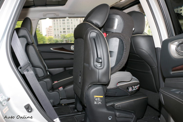 寬敞的車室空間QX60車長五米、軸距接近三米,可想而知車室空間非常寬敞。![]() ▲第二排座椅椅背角度有10段最多20度調整的功能且能前後滑移14公分。![]() ▲如果前座有安裝嬰兒座椅透過特殊機構無需拆除一樣可進出。![]() ▲第三排的乘客腳部,受惠於可調式椅背角度的設計,以及內凹的頂蓬,即使成人長時間乘坐也沒有問題。QX60的載物空間設計精心設計,第二排椅背至後行李廂門的深度,最多可達到137公分,換句話說,直放高爾夫球具時,第二排的乘客座椅還能繼續保留。這樣的座椅機能也提供了乘客進出第三排時能擁有更寬敞的空間,甚至Q7、XC90車型更好。 ![]() ▲QX60七人乘坐時,行李廂就有447公升的容積,五人乘坐與二三排躺平的情況,更分別達到1277公升、2166公升的程度。