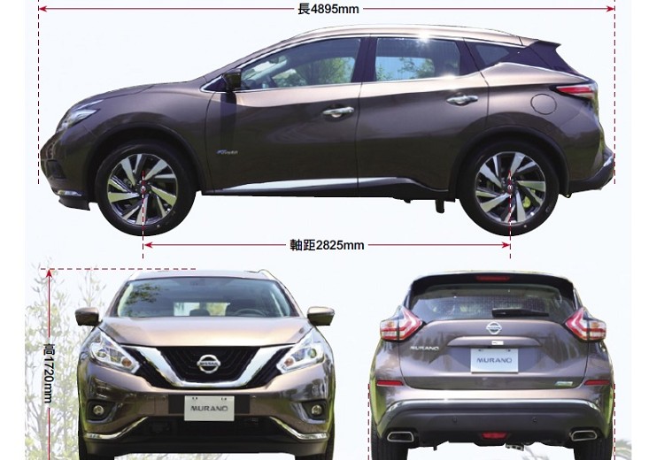 新世代科技造型2014年的紐約車展中發表第三代Murano,2015年正式量產。來到第三代車型不僅留有美國魂之外,還加入歐洲美學細緻度大大進化。先從外觀來看,新世代車型有著深邃的未來感,利用誇張的折線突顯出律動感,外觀完美移植RESONANCE概念車設計風格,車頭採用V-Motion設計元素,有點類似X-Trail的水箱護罩只是面積更大。前後燈具承襲Nissan 370Z的迴力鏢造型,頭燈內有LED遠、近光燈,後尾燈除了方向燈與倒車燈其餘則是LED光源,在夜晚塑造出最搶眼的識別特徵。