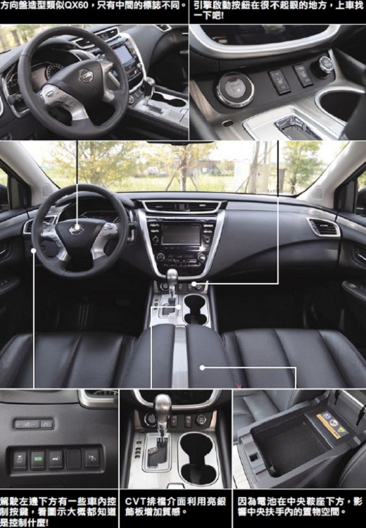 無壓力感內裝氛圍全新世代Murano車內有著全新造型設計,原廠表示這一次要給消費者一個溫馨舒適又別致內裝質感。確實第一時間坐進車內,肉眼所及之處刻意包裝來達到該有的效果,對我來說最直接感受到三層減震設計的座椅,有如自身在家裡的沙發上,有效降低身體疲勞並帶來最佳的舒適性。坐在椅子上,眼前被毆翼造型中控台環繞,無形間帶來幾分安全感;上一代在中控台上有多達25個按鍵,新世代簡化成10個按鍵,主要功能操作簡化於觸控面板裡,觸控板距離貼近消費者使用上就手。駕駛者前方七吋MID智慧型車模式提供所有重要資訊,不用刻意移轉是現就能讀取目前狀態,切換則從方向盤上的按鈕來控制。