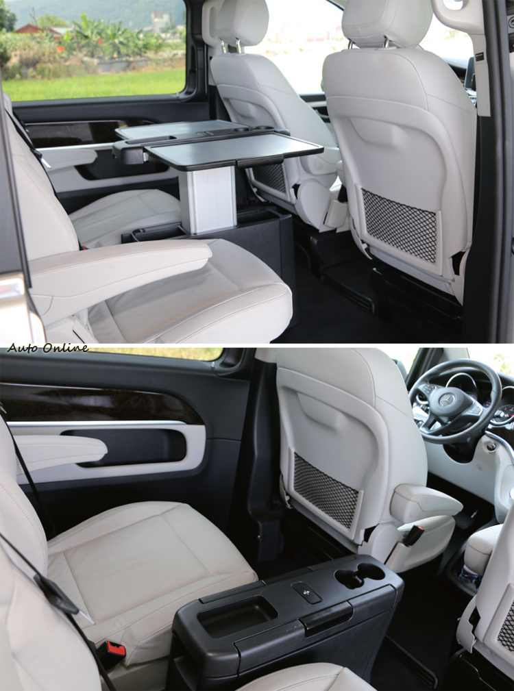 第二排還有一樣實用設計,也就是可前後滑移的折疊桌,翻開後能置放筆記型電腦或作為餐桌使用,平時也能隱藏作為扶手和置杯座,嫌佔空間還可推到第三排,甚至可以直接移除。第三排同樣可容納成人舒適乘坐,頭枕與三點式安全帶一應俱全,並且有簡單的扶手和置物處設計。