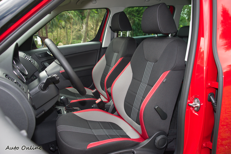 ![]() 車室內裝部分的專屬配備則有碳纖風格的中控台飾板、Monte Carlo銘牌車門檻、三色布紋座椅、方向盤、排檔座、腳踏墊加入紅色縫線、金屬材質油門與煞車踏板等。 ![]() ▲跑車風三色布紋座椅。