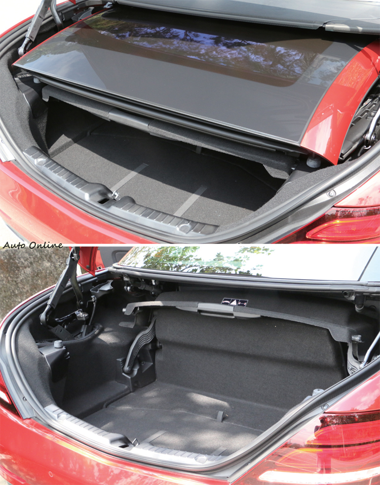 ![]() 兩人世界,座艙中每樣配備都會被放大檢視,SLC比較可惜的是內裝格局沒有專屬的設計,這讓它看起來和一般賓士房車差不多,少了點跑車該有的獨特性。然而透過混搭運用不同材質的飾板後,還不至於給人單調保守的感覺,而且試乘車加選AMG Line之後,呈現出來的質感還是相當不錯。親身坐進車內,這才發現原來小改款後有不少地方已經和過去完全不一樣了,首先注意到的就是它的排檔桿,已經換成與AMG車型類似的短捷裝置,並且換成按鍵入P檔的設計。中控台雖然因為世代尚未更替,依舊保留舊型的操作面板,不過仍可透過選配的方式與智慧手機整合連線,也可加購Garmin導航系統。方向盤則換上全新平底設計的Nappa真皮包覆型式,當然方向盤上的多功能操作鍵也隨之換新。至於儀錶的配置則維持雙筒式造型,只在底圖加上賽車方格旗紋。AMG Line所配置的跑車座椅,造型和支撐性都很不錯,紅色安全帶同樣能為稍嫌熱血不足的座艙加點分。 ![]() ▲車頂收摺機構巧妙藏於行李廂內,保留了基本的容量能用來置放個人行李。SLC 200當然一點都不陽春,但就299萬的售價來看它的配備等級,也不覺得有很大的吸引力,就以這部試乘車來說,所加選的幾樣配備看似平常,卻已經讓價格衝上326萬,可惜的是,台灣賓士已經不再引進中階車型,想要升級只能直上SLC 43的AMG車型,但兩者價差實在太大,耍帥前還是得掂掂自己荷包斤兩。