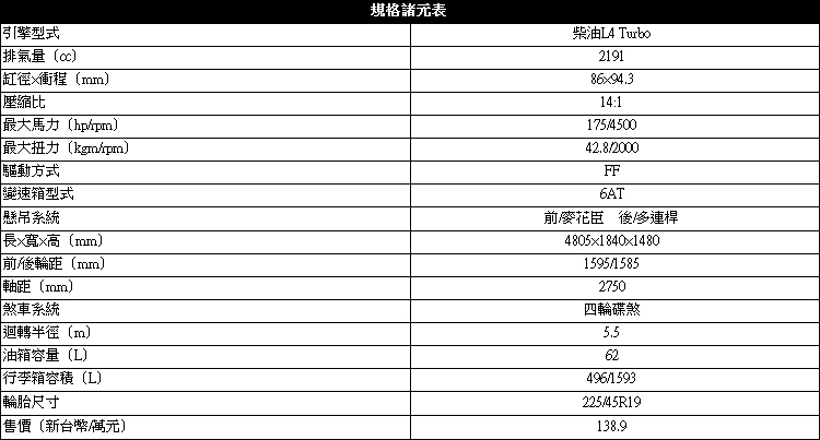 我們認為這組引擎和一般柴油引擎最大不同,在於它的寧靜度和舒適性真的很不錯,我們喜歡它的油門線性程度近似汽油引擎,且保有柴油引擎該有的低轉強勁推力,還有車輛在高速巡航的穩定,以及逼近彎頂點前重踩煞車和重新加速時,那種流暢與信任感。2.2 Sky-D開起來不會給人遲鈍慢半拍的感覺,重點是開進安靜的巷弄,再也不怕吵到別人。