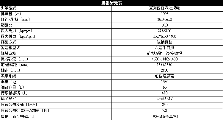 ![]() ▲以L形排列的LED近光燈帶出頭燈組設計複雜的機能美。![]() ▲尾燈組改為三道L形光條設計。![]() ▲車尾下護板整合了左右單出菱形排氣尾管。![]() ▲17吋鋁圈從原本十輻改為五輻雙肋式樣。