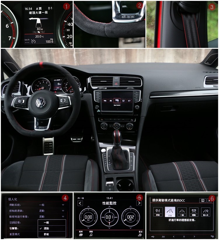 ![]() ▲尾管安排及分流器都是專屬設計,可惜未能表現出該有的性能感。特別式樣當然在外型上要有比較特別的裝扮,因此它有一套全新的保桿,兩側導流柵的造型也比一般GTI看起來更凶悍。專屬的空力套件組突顯了侵略的性格,車尾擾流也加大尺寸,搭配雙出的排氣管、分流器和專屬樣式的19吋輪圈,都是為了配合Clubsport更為運動化的產品特性。和標準GTI相同的是,紅色依舊是重要的點綴重點,除了貫穿左右頭燈和水箱罩的紅色飾條,煞車卡鉗也應用紅色塗裝,而黑色處理的導流柵則與車門下緣黑色飾貼融為一氣,最後就是把後視鏡外殼黑化處理。 ![]() ▲台灣銷售版本在配備上與歐規版“稍”有不同,從照片的比較應該不難看得出來。![]() ▲(1)內建導航系統,簡易資訊也能顯示在儀錶中央顯示幕。(2)專屬多功能麂皮方向盤附紅色指標線,握感相當不錯。(3)少數幾處質感仍難以擺脫塑膠感,但也有細節相當講究的地方。(4)DCC主動式底盤控制系統可獨立調整多種車輛特性,除非追求極端,基本上還算夠用。(5)螢幕的性能監控功能雖然能自行決定顯示項目,但恐怕給副駕看的機率比較高。(5)五種駕駛模式提供駕駛選擇,用以改變車輛的特性。