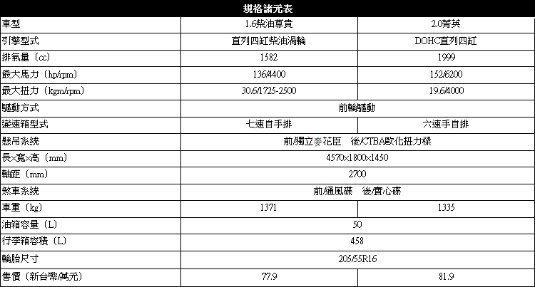 八吋觸控螢幕還是要選配...![]() 呼應看似簡單但其實頗有變化的外觀線條設計,車室控台線條感覺也是簡單俐落,以直線為主要基調,搭配一些弧形的角度轉折,讓視覺上的負擔比較少但又不會覺得呆板。儀錶板為兩大圓夾中央3.5吋行車資訊顯示幕的常見設計(2.0菁英與1.6柴油型,可惜無中文顯示,其他車型無行車資訊顯示幕,高階多功能旅程電腦也是這兩車型才有)。有四向調整功能的方向盤外圈造型少了些人體工學的設計,所以像大拇指/虎口少了點額外的固定性;方向盤音響控制鍵除了1.6柴油與2.0豪華型以外都有。 ![]() ▲2.0中規以上車型配雙區恆溫系統。![]() ▲整合多項影音、導航、通訊功能的八吋觸控螢幕為全車系選配。![]() ▲內建導航是採用Papago的PureNavi S1軟體。![]() ▲音響系統內的等化器調整功能可用手在螢幕上畫一道曲線就完成。![]() ▲2.0L中規車型以上配備皮革包覆的滑動式中央扶手。![]() ▲座椅支撐感為中等略硬,長途乘坐較不會疲勞酸痛。![]() ▲後座椅背有適當的後傾角度,地板中央隆起不大。![]() ▲全車系後座都有空調出風口。