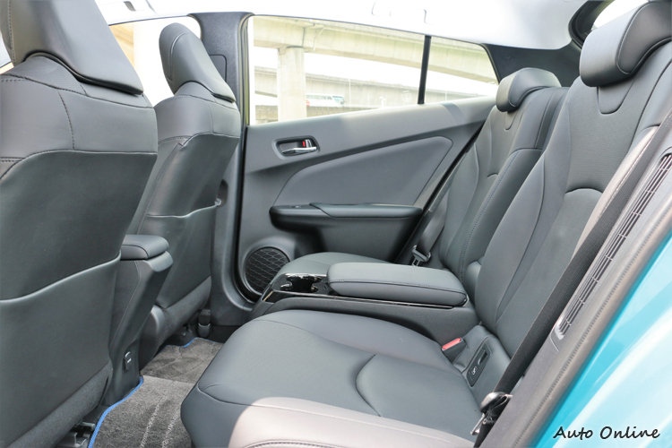 後座乘客在膝部達到中型房車的水準,擁有一個多拳頭的空間,但很可惜頭部受到車頂壓迫連半個拳頭都不到,再加上受到後面的電池影響座椅椅背有點偏直,乘坐起來稍有不適感。在座位的配置上,Prius PHV走高質感路線,也就是後座兩張獨立座椅只能坐兩個人,中間被置杯架與置物箱取代。