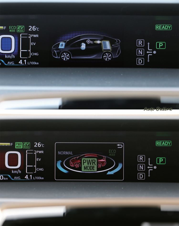這輛車的重頭戲,Plug in hybrid插電式混合動力主要可分為內燃機引擎與兩顆電動馬達,搭載1.8升排氣量直列四缸dual VVT-i Atkinson循環引擎,特殊情況下會爆發出最大馬力98hp/5200rpm與14.5kgm/3600rpm最大扭力。馬達部分有MG1與MG2雙馬達,在Prius Hybrid車型上,透過單向離合器鎖定,MG1不僅是發電機亦當馬達使用,是Toyota首輛雙馬達動力,不讓任何一點動力流失。搭配上E-CVT電子控制無段變速箱,任何模式下都有順暢綿密的加速力道與平穩性。