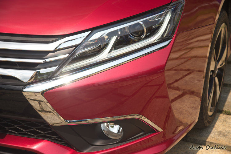 DYNAMIC SHIELD車頭設計透過頭燈、霧燈間的上下/左右對稱關係來與車頭中央的水箱罩產生「X」形的交叉延伸關係。這概念其實很早在其他品牌車款就有運用到,但Grand Lancer透過鍍鉻線條將頭/霧燈與水箱罩銜接整合之下,構成單一且更為有力的車頭視覺。