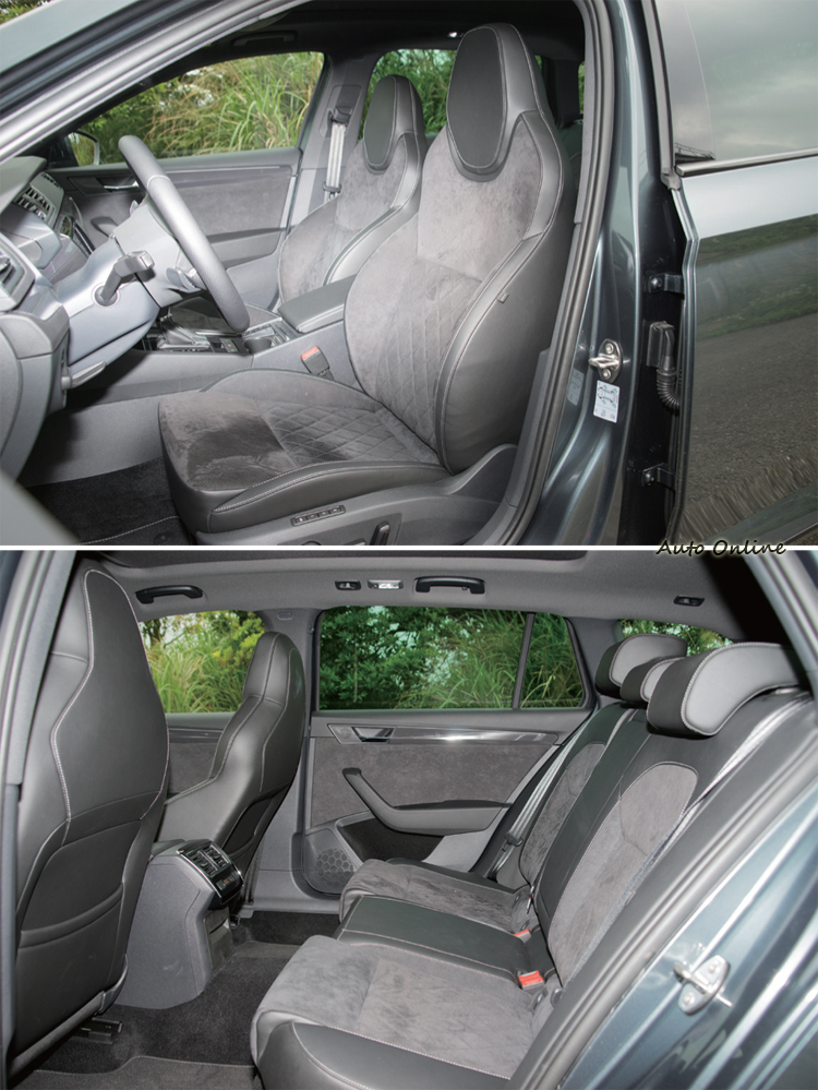 Sporty黑內裝風格![]() 坐進車內,一樣是一片黑色調映入眼簾,Alcantara皮革包覆滾白縫線的跑車式座椅不僅摸起來觸感好,在椅背與椅墊也有比較突出的側邊支撐墊提供良好的測邊支撐性,駕駛座也提供八向電動調整與三組位置記憶功能。 ![]() ▲黑色Alcantara真皮滾白縫線包覆的座椅帶來更好的質感與包覆感。![]() ▲平底方向盤手感不錯,可控制音響、電話與換檔。二大包二小圓的儀錶沒什麼變化,少了點紅色指針/背光之類的刺激感官設計來加分,中間則夾著COLOR MAXI DOT彩色行車電腦顯示幕提供不少實用的行車資訊。中控台是配BOLERO 8吋彩色觸控螢幕MIB多媒體資訊娛樂系統,除了支援藍芽、Aux-in與USB外也有SD卡插孔讓你插入SD卡就可以播放音樂。Smart Link系統則讓你將智慧型手機與系統連結,在螢幕上顯示與操作手機畫面,車上也提供了手機無線充電板方便手機充電,手機在開車時使用下也不會因此耗盡電力。 身為品牌旗艦,Superb Combi Sportline的實用性配備/設計也是一整個豐富。手套箱內有保冷出風口及平板電腦的收納設計、前後座車門置物槽都可收納1.5升裝的飲料瓶罐、行李廂多層活動式地板、雙前座車門傘筒等,讓平常用車時的便利性大增,用車體驗也會因而加分。