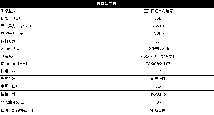 動力與操控符合它的身分![]() ▲引擎使用一顆1.2升直列四缸自然進氣引擎,最大馬力為91ps/6000rpm與12.2kgm/4400rpm最大扭力。實用小車在動力部分只求夠用無熱情可言,當然如果換上性能引擎那就變成鋼砲了!引擎使用一顆1.2升直列四缸自然進氣引擎,最大馬力為91ps/6000rpm與12.2kgm/4400rpm最大扭力,現今的技術已經很少看到沒有破百匹馬力的動力,Ignis算是少數中的少數。也許車友會說為何不用1.0升三缸渦輪增壓引擎,原廠給的答案表示,這樣我們在售價上會很有壓力,會打到自己兄弟Baleno。變速箱為CVT無段變速系統,能幫助彌補些底轉速的加速力道,到了高速則沒有太大幫助,平均油耗實測達到19.9km/l。 ![]() ▲懸吊採前麥花臣、後扭力梁式,是大多數小車的相同機械結構,靈活又安心的駕控感。![]() ▲什麼都能妥協只有安全不能,Ignis標準配備完整的主被動安全。