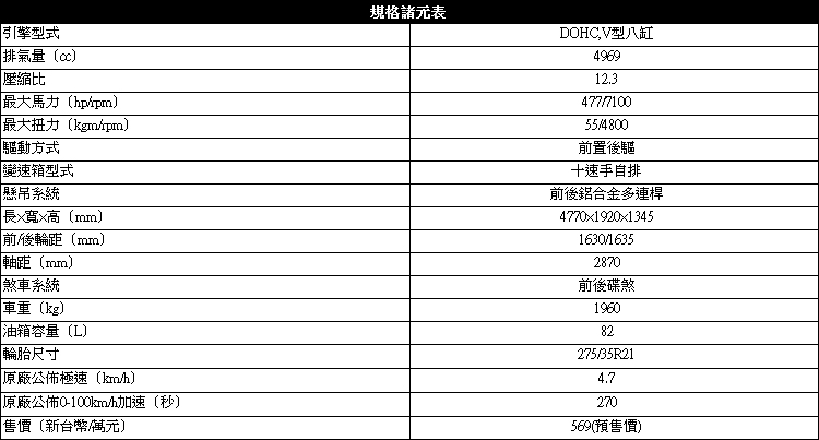 5.0 V8自然進氣引擎+十速手自排的暢快加速感