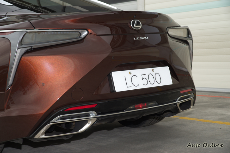 但在變速系統上則與RC F用的八速SPDS手自排不同,是採用Direct Shift-10AT十速手自排變速箱,換檔時的反應回饋優異,再透過從駕駛者對油門、煞車踏板踩踏深度、車輛的重力加速度G值等參數,來判斷駕駛者當下的操作意圖,來選擇最適當的檔位控制動力輸出。同時,LC 500也搭載了動力聲浪控制系統,透過排氣系統內部的發聲器與閥門切換,配合引擎轉速、車速、油門踩踏深淺等條件,計算適當的聲量與頻率,營造出高亢的引擎聲浪(與一些超跑偏向尖銳金屬音的類型有所不同)。