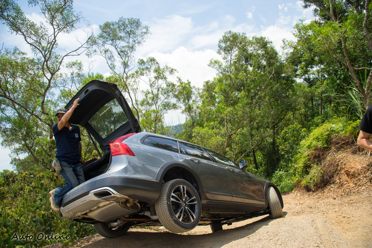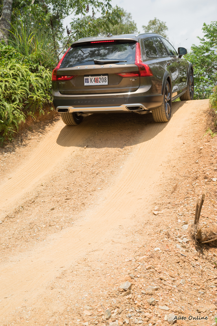 接著遇到下坡急彎,而且接近彎底的左側路面有著相當大的隆起,造成與右側路面間有不小的高低差。但是我們依然刻意地盡量靠左側入彎,讓車子「騎」上隆起而讓右後輪舉起。這時將車煞停並且爬到車後嘗試將感應式電動尾門打開也很輕易地做到,代表車體並沒有因此產生變形。舉腳狀況當然也是考驗著車子四驅系統脫困能力與車高與三大角度(進坡角、跨越角、離坡角)的時機。車身距地高較V90高出約7公分的V90 Cross Country也毫無問題,只要行進路線角度抓好,並配合穩定的油門控制,系統便會對扭力分配做最佳化把區動力分配到尚有抓地力的三輪完成脫困繼續行進。