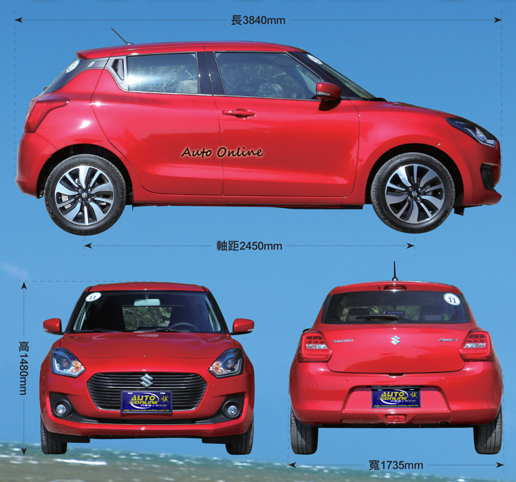 新世代Swift車身尺碼長、寬、高為3840mm、1735mm、1480mm,拿出上一代車型數據發現稍微縮水,只有車寬增加40mm與軸距加長2450mm,這樣就足以改變車室空間,當然稱不上寬敞卻也夠用。