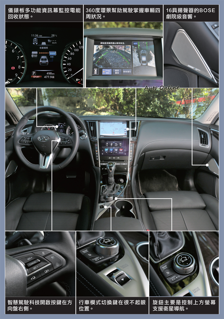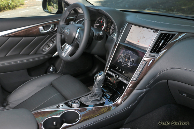 ![]() ▲換上與Q60相同造型的方向盤與排檔桿,中控台為雙螢幕設計。中控台影音、冷氣系統採雙螢幕設計,上方的螢幕主要提供微星導航與車外環景使用,使用方法可透過觸控或者中央鞍座上的旋鈕切換。下方的螢幕是主要是 INFINITI InTouch影音功能切換介面,從選單能調整冷氣、音響、行車模式等功能,主動安全防護也能從這螢幕分別獨立啟閉各項功能;另外,螢幕也能監控車輛狀態、旅行電腦等資訊。原廠在螢幕兩邊還是保留實體按鍵,因為在某些環境下實體按鍵控制還是比較方便。新年式新增車內氣氛燈與升級16具揚聲器的BOSE劇院級音響,跑格與豪華兩種氛圍結合為一。
