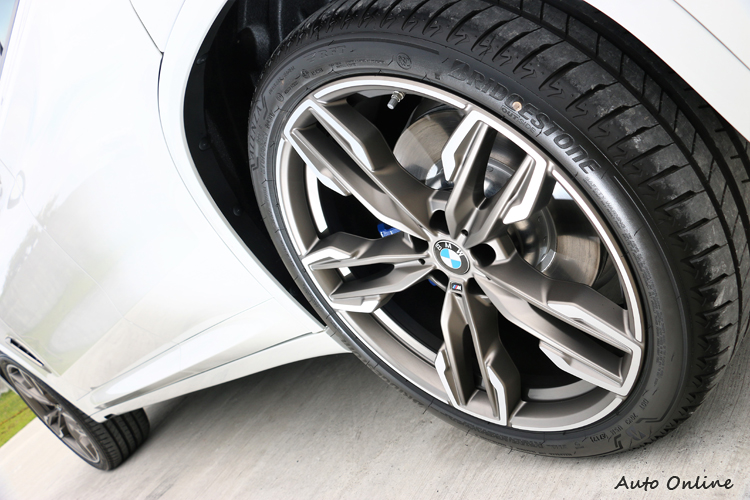 ▲普利司通失壓續跑胎結合21吋規格鋁圈,內部有M款四活塞煞車卡鉗。
