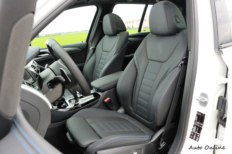 ▲ M款跑車化座椅包覆性非常好,藍色縫線加上M Sport三色標誌點綴,感受到滿滿戰鬥氛圍。