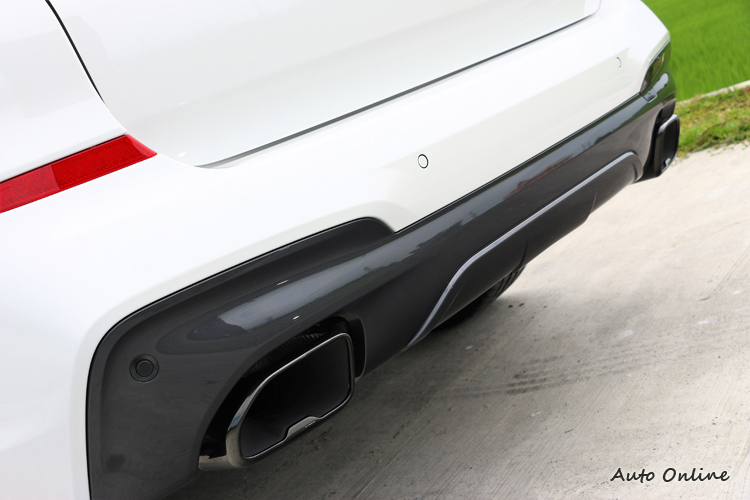 專屬M Performance鍍鉻材質勾勒前保桿進氣壩、雙腎型水箱護罩外框、後視鏡蓋等部位。黑色高光澤車頂架、窗框及同樣採用黑色高光澤材質的雙邊矩形排氣尾管,替休旅車增添跑格元素,外觀能輕易分辨X3 M40i與一般車型的不同。