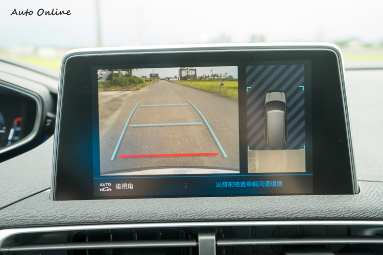 試駕車上有屬於選配的全景視覺停車輔助,以俯視角度幫助駕駛人了解車身周圍環境,不過在剛切入倒檔之下,系統似乎沒有辦法立即擷取周圍影像而是以條紋顯示,反應速度還有進步空間。另外,可以幫助駕駛者從停車處開車出去時觀察前/後兩側狀況的多模式自動切換駐車在1.6 BlueHDi車型上只有後視鏡頭,GT車型上才是前後都有。
