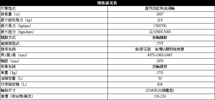 重點是電動馬達的扭力輔助讓加速的反應不會像一般中小排氣量引擎搭CVT那樣平順「但也溫吞」,而是比較接近3.0L排氣量(或更大些)自然進氣引擎那種引擎轉速隨車速上升的一氣呵成感。與渦輪馬力引擎較多特定轉速區域「爆發」的感覺又有所不同。相當適合想開快但非熱血飆車的駕駛風格,也比較符合這部中大型豪華房車的產品屬性。而在更好的動力輸出反應下,平均油耗反而更佳(20.0km/h)也是油電車的特性。