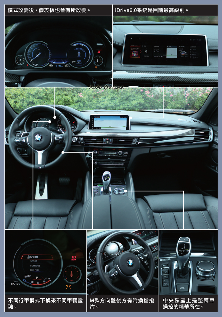 汽柴油同駕該如何選擇說了那麼多有關BMW X6 M Sport Edition的優勢,購車之前會先碰到的問題就是汽油與柴油動力如何選擇,同為373萬元的價格讓人有點不知所措,開過X6 xDrive35i M Sport Edition之後,在這以我的論點給你參考。如果是購買大型休旅車,我絕對會選擇柴油引擎,最大原因是柴油引擎的低轉速高扭力特性,對上車重不輕的大型休旅車,還是可保持較輕快的起步加速,轉速不須拉高可得到寧靜座艙質感,但如果加上跑格那就不一樣。跑格強烈的X6卻是汽油引擎對味,汽油引擎有著高延展轉速的優勢可運用,激烈駕駛時拉至紅線區域,車外傳來的聲浪有如天籟,徹底把跑車魂釋放,這也是為什麼賽車很少看到柴油引擎,畢竟汽油的穩定度、高轉爆發力才是跑車該有的調性。