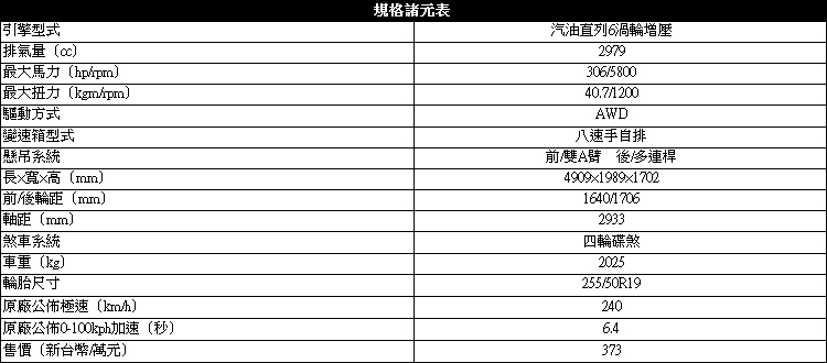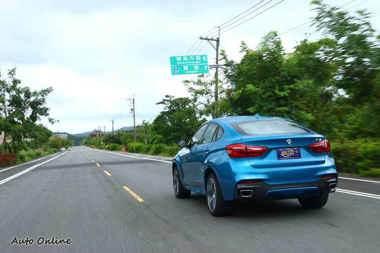 龐然大物加速百公里只需6.4秒![]() ▲搭載的是一顆3.0升直列6缸渦輪增壓引擎,最大馬力有306hp以及40.7kgm最大扭力。在動力方面,BMW X6 M Sport Edition套件同時推出汽油與柴油兩種動力,分別為BMW X6 xDrive30d與X6 xDrive35i,並且刻意的汽、柴油同為373萬元。此次所試駕的車款為X6 xDrive35i M Sport Edition,搭載的是一顆3.0升直列6缸渦輪增壓引擎,最大馬力有306hp以及40.7kgm最大扭力,搭配上Steptronic運動化八速手自排系統,重達兩噸的龐然大物可以在6.4秒完成百功力衝刺,說它是一輛著重跑格化的休旅車也不為過。 ![]() ▲增加M款跑車化電子懸吊,可根據動態行車模式而改變避震器阻尼設定,優化整體車身動態表現。實際上路體驗,X6比起一般的SUV有更高的過彎極限,超越中大型房車靈活度。配備主動式轉向系統、彎道控制系統等,達到更精準、更犀利的行車轉向循跡,龐大的X6車頭指向性超過同級車水平。xDrive四輪驅動系統是X6殺灣功臣,四輪驅動系統不僅能應付輕度越野,在山路上,電腦自動偵測調整動力分配,維持四輪都有最好抓地力,也能藉由輸出、制動輔助車頭轉向,不需要多加思考就能開得飛快,跑車底盤搭配上休旅車外殼的結果是BMW X6 xDrive35i M Sport Edition。