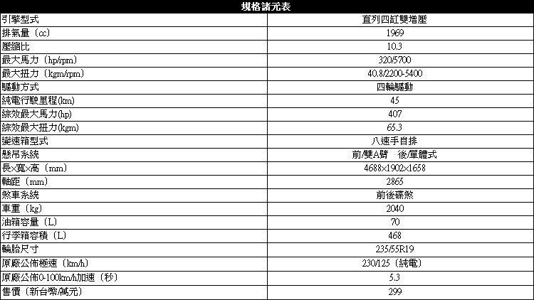 動力上與T8 Inscription同樣搭載具有320hp/5700rpm最大馬力、40.8kgm/2200-5400rpm最大扭力的T6雙增壓汽油引擎負責驅動前輪,加上一具具有87hp/7000rpm最大馬力、24.5kgm/3000rpm最大扭力的電動馬達負責驅動後輪所組成的油電動力系統,搭配Geartronic八速自排變速箱。