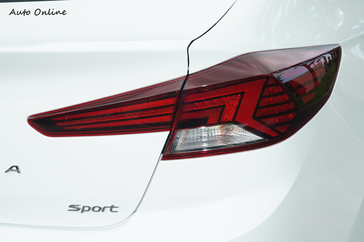 車尾換上了造型更漂亮的LED尾燈,車名則與上級車款Sonata看齊,Elantra與Sport字樣從原本分別位於左右尾燈之下改為Elantra拉大字與間隔距離直接位於車尾下方,Sport字體所小接在右下方的方式,這種呈現方式也給人比較大氣且有自信之感。