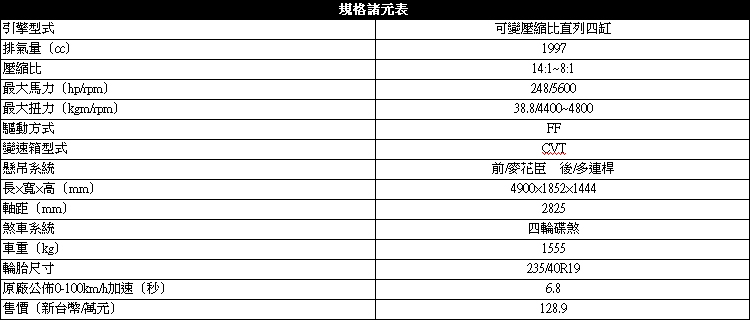 全球首創可變壓縮比引擎![]() ▲引擎動力搭載的是全球獨創可變壓縮比VC Turbo引擎(VARIABLE COMPRESSION RATIO ENGINE)。這輛車的最大亮點除了外觀與內裝大幅度進化外還有引擎科技,引擎動力搭載的是全球獨創可變壓縮比VC Turbo引擎(VARIABLE COMPRESSION RATIO ENGINE)。 ![]() ▲標榜著運動化跑格轎跑車,並運用上可變壓縮比渦輪增壓引擎,底盤還選用賽車等級避震器,以樂趣來論絕對是同級別中佼佼者。![]() ▲原廠表示避震器筒身換上單筒式,優點在於活塞動作反應快且散熱性好,大多用於賽場上。