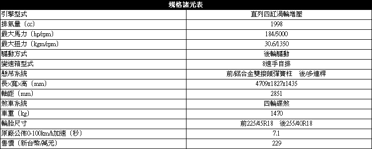 動力夠用剛剛好![]() ▲動力系統搭載的是代號B48四缸2.0升渦輪增壓引擎,藉由調校與內部機件些微差異上的不同,最大輸出動力與330i有些差異。動力系統搭載的是代號B48四缸2.0升渦輪增壓引擎,藉由調校與內部機件些微差異上的不同,最大輸出動力與330i有些差異。最大馬力為184hp/5000rpm及最大扭力30.6kgm/1350rpm,馬力與扭力都比起330i小了一點,如果想要後續做升級達到相同動力,有改裝店家告訴我除了電腦之外還得更換活塞才能達到相同輸出,當然你也可以只提高渦輪增壓,只是保固問題必須自行承擔。變速箱Steptronic運動化八速手自排變速箱,綿密的檔位切換帶來直接且暢快的力道,靜止加速到百公里為7.1秒,與330i的5.8秒差異來自於引擎輸出。 ![]() ▲試駕車款所搭載的是一般懸吊避震系統,個人覺得更適合台灣路況。![]() ▲安全性方面標準配備BMW Personal CoPilot智慧駕駛輔助科技,主動跟車與車道維持系統可降低駕駛疲勞感。