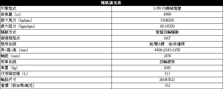 首先在動力部分使用一顆目前市面少見的V型八缸5.0升機械增壓引擎,畢竟Downsizing風潮盛起,大排量、多缸數的配置已成為稀有品。大排量心臟可爆發出最大馬力550ps/6500rpm以及最大扭力69.3kgm/5500rpm,從數據上看似高轉引擎,卻藉著大排量優勢,低轉速就能有強勁推力一路維持到高轉,少數特殊車迷就是喜愛這種調性。搭配8速ZF手自排變速箱,結合智慧型IDD四輪驅動系統,重達兩噸的巨獸也能在4.5秒完成0-100公里/小時加速測試,極速設定在274公里/小時。