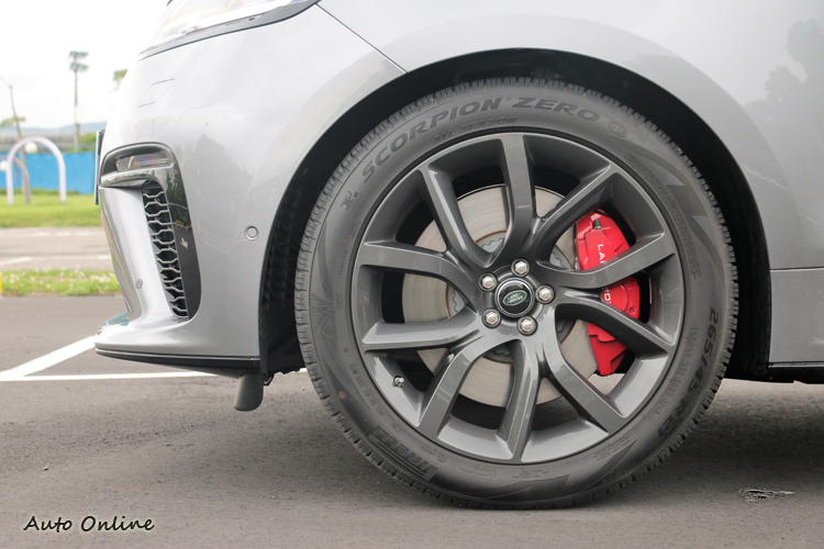 底盤除了懸吊系統外,換上265/45 R21吋倍耐力性能胎,有效的將大動力傳遞於地面上;煞車系統升級到前395mm、後 396mm 直徑的煞車碟盤,搭配紅色四活塞卡鉗,能有效幫助煞車散熱且提高制動效率,確保在高速時可迅速的降低車速帶給駕駛者幾分信心。