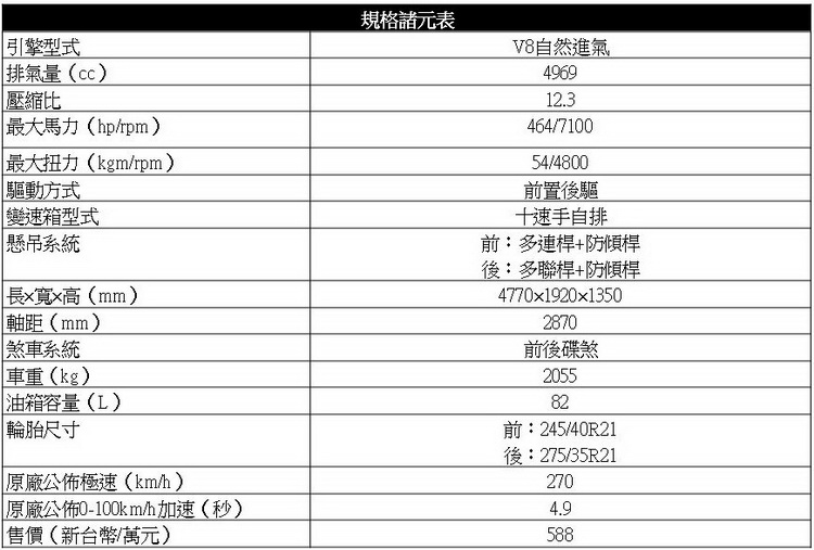 在輕踩油門時,動力輸出反應不會神經質,開起來跟家庭車一樣輕鬆,但當你油門稍重或踩油門速度較快,強大加速力道馬上跟上讓車輛衝出。下坡時也會適時固定在低速檔,不因放掉剎車車速漸快就跟著升檔。聰明的油門反應與換檔邏輯算是蠻令筆者有感的,對於將近500匹馬力的性能實力來說它也是部可以比較放緩心情來掌控的車(自然進氣引擎的天性也是因素之一吧)。