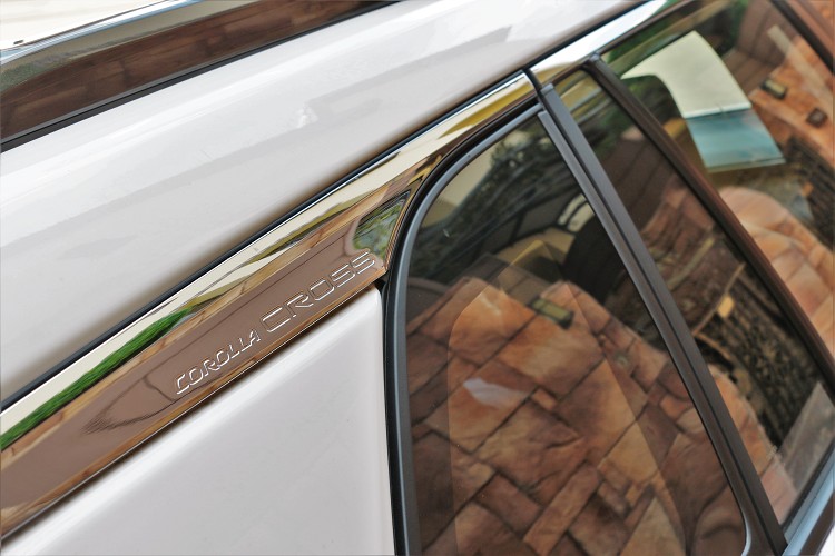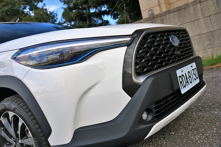 同級中車身尺寸最大Toyota Corolla Cross設定車格為CUV,也就是中小型休旅車,剛好就介於RAV4與CH-R之間,車身尺寸長寬高分別為4,640mm、1,825mm與1,620mm,軸距則為2,640mm,與同級對手HR-V及Kicks相比,Corolla Cross有著些微優勢。外觀造型融入家族設計卻也很有自我風格,首先車頭水箱護罩與下氣壩形成雙梯造型,是品牌休旅車專屬特色,頭燈採不規則修長型,高規車型配置的是LED頭燈。 ![]() ▲油電旗艦車型除了大燈採用LED之外,下方的霧燈也試LED光源。![]() ▲車側C柱上方的鍍鉻飾板,上面印有Corolla Cross專屬字樣。![]() ▲Toyota Corolla Cross是台灣和泰汽車首款的國產化休旅車。