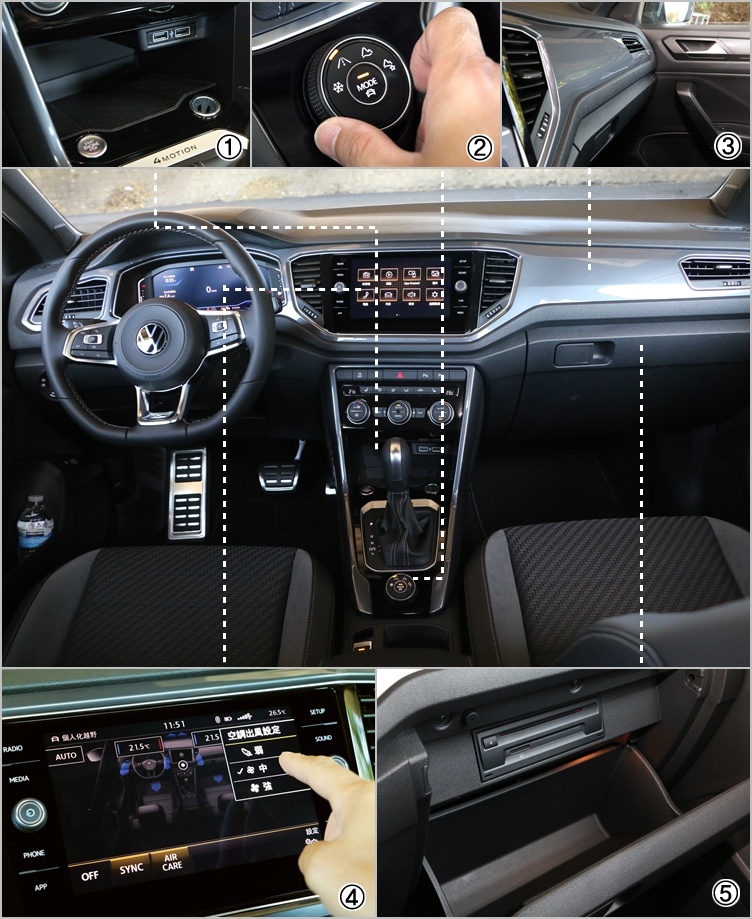 ▲(1)12V和USB電源插座一應俱全,唯獨沒有提供無線充電座的配備。(2)4MOTION車款專屬的越野模式選擇旋鈕,圖示說明清楚明瞭。(3)座艙以飾板搭配力求質感的提升,不過仍難掩塑膠味偏重的缺憾。(4)空調系統也可透過中控觸控螢幕進行調整,選單設計相當直覺。(5)手套箱內部沒有減噪植絨的鋪面,不過裡面竟然還提供CD播放器!