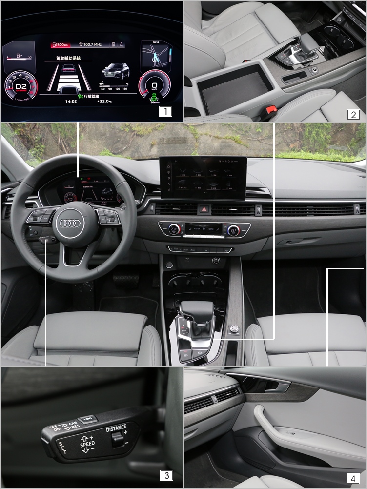 ▲(1)數位儀錶提供豐富的車輛資訊,同樣提供多種顯示模式。(2)前座鞍座的佈局豪華高雅,置物空間也很充裕。(3)主動巡航控制和車速限制的功能是透過撥桿完成。(4)試駕車選配的是天然橡木灰飾板,實際販售車型則採用鋁質飾板。