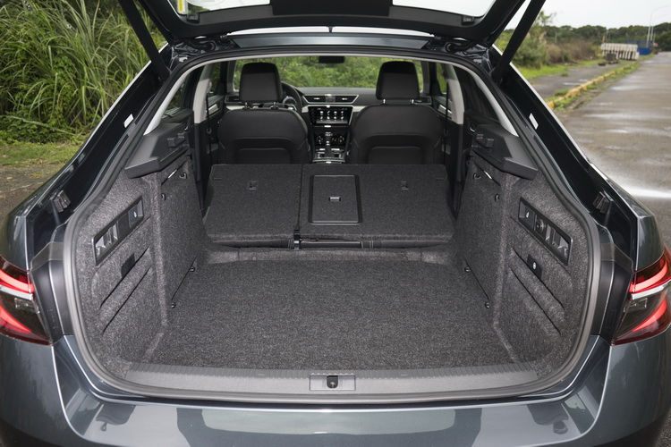 行李置物空間表現是Superb的強項,行李廂收納空間即使是只算到後座椅背高度也有625公升(包含41公升的備胎室空間),如果是算到頂到斜背尾門的空間的話更可達到722公升,不過後座椅背高度上方的空間不規則,在置物運用上會比較受到限制。將後座椅背向前放倒的話,整個後方置物空間容量達到1760公升,後座與行李廂間有些微高低差,但整體平整度還算不錯。而腳踢感應式尾門列為標配也彌補了斜背尾門在開啟後位置較高,對身材嬌小者來說可能不易搆到的問題。