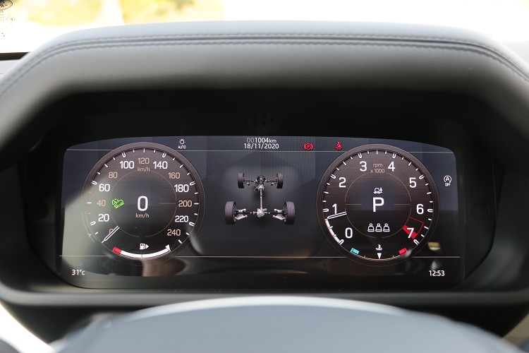 中控台由一個10吋多媒體觸控式螢幕與儀表板12.3吋全數位化螢幕建構出科技感,車輛資訊都能由這兩個屏幕上取得,使用上非常方便與直覺。中間螢幕的下方是全車精華處,除了排檔桿之外,冷氣介面以及Terrain Response 2 第二代全地形反應系統都由這兩顆旋鈕操作,搭配上方螢幕圖示,可快速選擇所需要的越野模式。