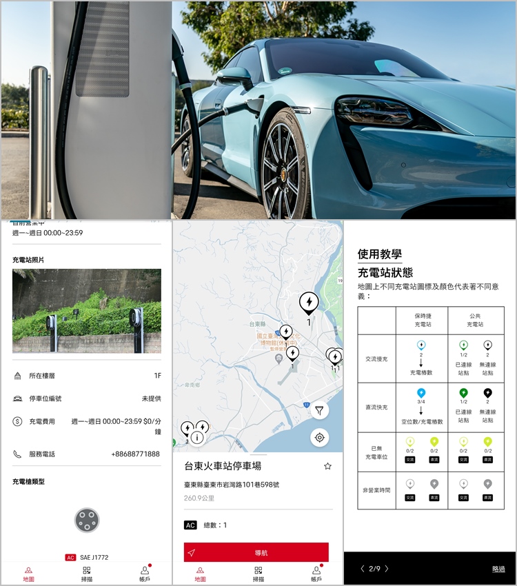 ▲透過保時捷充電服務App,可以查詢充電據點所在地、充電樁數量、服務時間、收費標準、剩餘空位...等資訊,從圖示就能清楚掌握附近可用資源