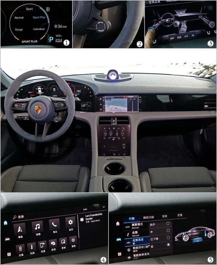 ▲(1)數位儀錶可切換顯示多項資訊,也能全螢幕投射導航畫面。(2)跑車計時套件原廠報價70,800元,是絕對必選的配備。(3)這款車出風口沒有葉片設計,調整風向的方法是在螢幕上直接拖曳,相當有意思。(4)目前保時捷的PCM僅支援Apple而無Android手機連線功能。(5)各種底盤及車輛調整設定,都有清楚的文字和圖示,使用上相當簡單。