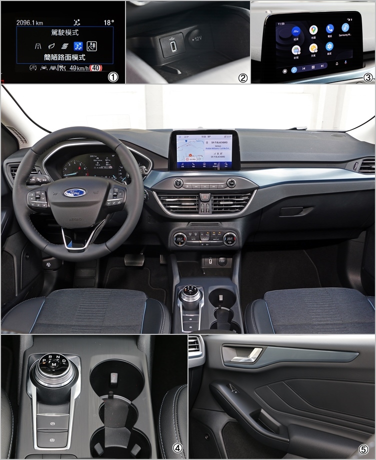 ▲(1)簡單切換駕駛模式就能讓這款二輪傳動車在產業道路上橫行無阻。(2)諸如USB Type C充電孔和無線充電座,已經成為汽車不可或缺的配備。(3)SYNC 3.0支援中文聲控、導航以及手機連結功能。(4)旋鈕式換檔、電子手煞車、Auto Hold功能都是標準配備。(5)內裝用料及質感稱不上高級,不過設計相當到位,看起來很活潑。