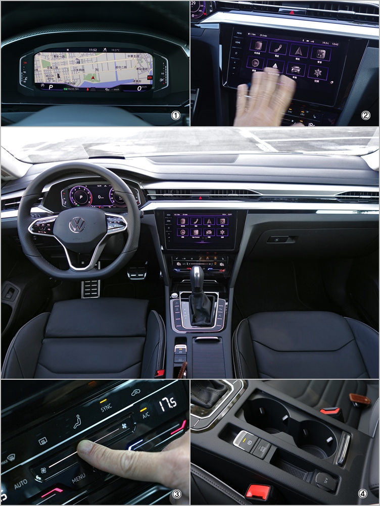 ▲①數位儀錶可切換顯示不同模式,已經成為豪華旗艦的必要配備。②座艙設備強調數位科技的整合,除了觸控還支援方便的手勢控制功能,揮揮手就能操作換頁。③操作面板採用全平面虛擬觸控式設計,看起來更簡潔,不過很容易留下指印。④儘管這是為挑戰高級車市場而打造,車內還是有些部位保有濃厚的福斯味。