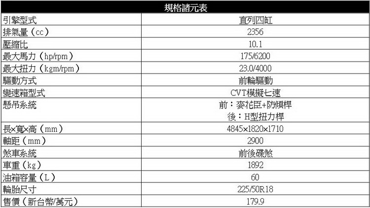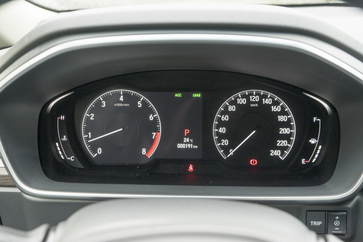 尾門為腳踢感應式自動啟閉,且具有自訂高度記憶功能也同樣有預約上鎖功能。另外還有離去自動上鎖功能,就是當車主熄火離開車子約二公尺以上時車門會自動上鎖,避免車主粗心忘記鎖門等情況。 動力不變之憾 雖然已經是本世代(第五代)產品週期中的第二度小改款,動力單元依舊不變,維持搭載2.4升排氣量的「Earth Dream」系列i-VTEC直列四缸自然進氣汽油引擎,可輸出175hp/6200rpm最大馬力與23.0kgm/4000rpm最大扭力,搭配模擬七速的CVT無段變速箱。