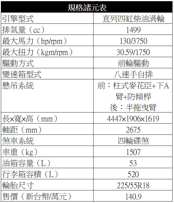 去年1.5L BlueHDi動力剛引進國內時我們便曾經為大家介紹過,這具柴油渦輪引擎可輸出130hp/3750rpm最大馬力與30.59kgm/1750rpm最大扭力,搭配EAT8八速手自排變速箱。由於柴油引擎天生特性,你或許不會覺得它的加速感很輕快,但當你注意到實際車速時,才發現車子加速真的不慢,只是少了幾分汽油引擎的犀利油門反應感而已。
