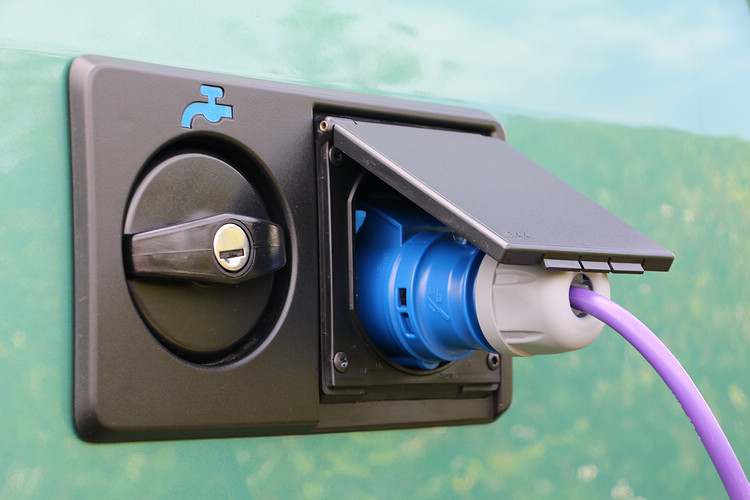 ![]() ▲(1)原本T6 California的蝴蝶窗開關,在小改款後已經改為上下內壓式開關。(2)乘客艙窗戶可加掛防蚊紗網,兼顧夜宿通風的需求。(3)+(4)折疊椅藏於後門板內拉鍊袋,至於折疊桌則是內嵌在側滑門內部,不需額外機構就能直接扣緊。從車外說起,在右側滑門上方外掛的是一組伸縮式遮陽蓬,使用T型轉桿將它展開後就是一具天幕帳,即使單人操作也很容易,搭建後並不會妨礙側滑門作動。車身左側可以看到外接電源插座,可接受110V-230V的電壓,不過是歐規型式;這是用來為車內第二、第三電瓶蓄電的設備,插電後,冰箱、冷暖氣或是廚房中島前方的插座即使不用發動引擎也能使用。 ![]() ▲透過左後側的外接電源插孔,熄火時也能持續供應冷暖器,旁邊則是清水注入孔。