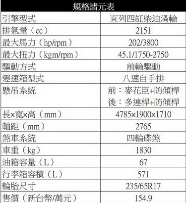具備VGT可變幾何渦輪增壓技術,採用鋁合金汽缸頭使引擎大幅輕量19.5kg,並針對滾針軸承凸輪軸與平衡軸進行調整,降低運轉時摩擦阻力,高壓共軌直噴供油機構壓力則提升至2,200bar。在排氣量略縮之下202ps最大馬力與45.0kgm峰值扭力的動力輸出數據比之前還微增了2hp,代表運作效率有所提升。 所搭配的變速箱也從之前的八速自手排換為車廠目前最新的8DCT八速濕式雙離合自手排變速箱,運作效率同樣比過去提升,主要是反映在燃油效益上。在性能表現上改款前的2.2L柴油渦輪已經表現不俗,相對之下新動力給人維持水準,沒有太亮眼之處,偶爾在退檔時拉轉加速的反應有略慢半拍。