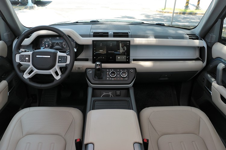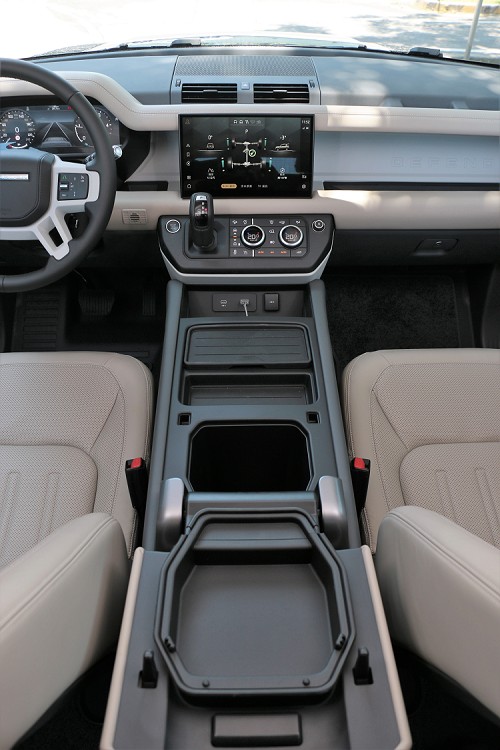 進到車內,整體座艙氛圍相當熟悉,畢竟之前與Defender 110接觸時間相當長,曾開去露營體驗過。中控台配置完全一樣,只是在新年式上面,原廠將11.4吋Pivi Pro多媒體觸控螢幕列為標準配備,且能支援Apple CarPlay與Android Auto連接功能。螢幕的下方則式冷氣以及Terrain Response全地形反應系統控制介面,兩者共用相同的旋鈕。中央鞍座在外國可選配成座椅,在台灣因為法規問題無此選項,所以造就出寬大置物空間,中央扶手內也能選配冰箱。