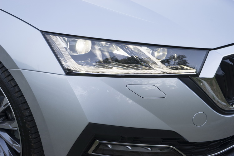 因為水箱罩面積擴大,頭燈就配合換上細長新造型看起來比過去方正設計銳利許多,且內部燈組也運用了捷克的水晶玻璃工藝,近看就可以察覺它的美感。不過這還是次要,更重要的則是標配Matrix LED智慧複眼頭燈組。燈組內側(較靠近水箱罩)的是矩陣式模組中的兩排LED單體,一排為近光一排為遠光;外側那顆則是遠近光雙LED模組,也就是提供遠、進光的基本光,然後再依照路況內側的兩排LED矩陣會即時自動變換光型,在需要較大範圍視野時會變成進光廣角照明,而在對向有車時則會避免對對向車造成眩光。