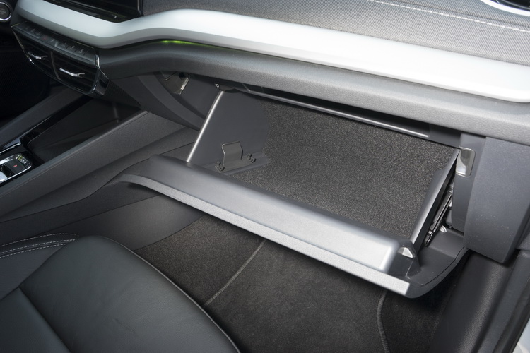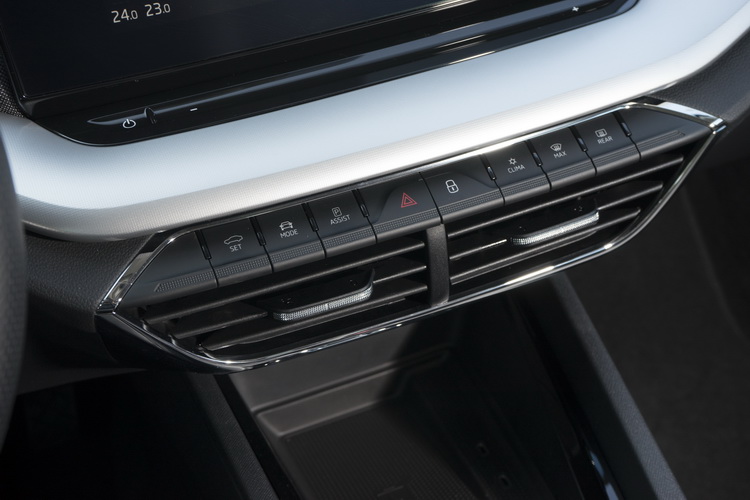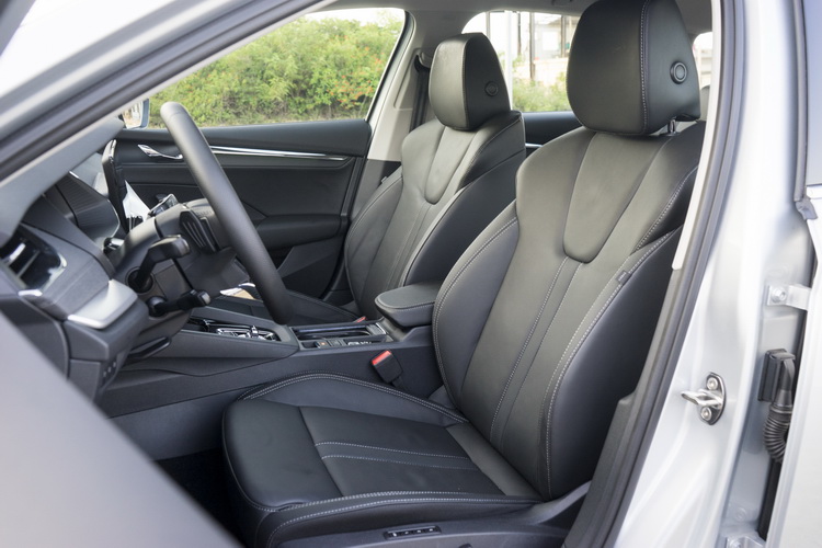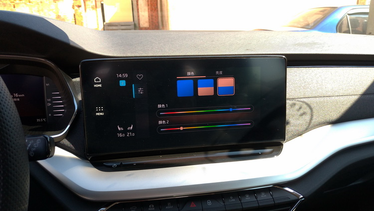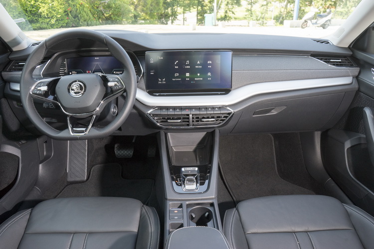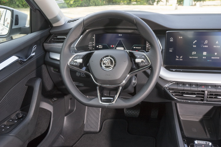 SKODA車款經常給人質感比較普通的「大眾車」印象,為了強化新Octavia的質感,在車門內側與前方控台大量使用軟質塑料來鋪陳,還搭配了單寧布紋飾板,以多樣的塑料處理來加強質感與層次,車門邊還有整條大面積的鍍鉻飾板也是同級少見的。不過有一點要小抱怨的是前方控台下層類金屬質感的飾板在強光下容易對駕駛者(其實對副駕駛座乘客也一樣)造成反光困擾,採深色或消光處理應該會好些。另外,在車內氣氛照明上現在也有所升級,車艙內上下層的氣氛照明顏色可以透過中控螢幕分別切換調整。